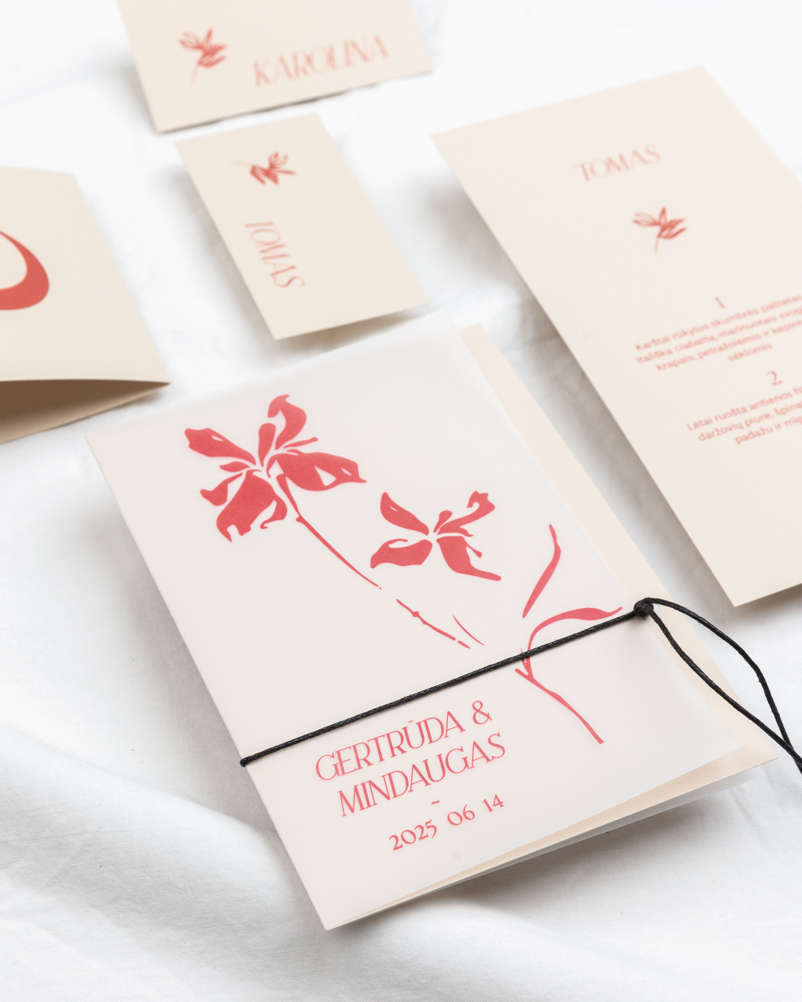 • vardo kortelės ARBA vardiniai meniu su vienu bendru meniu visiems svečiams (jeigu meniu su skirtingais pasirinktais patiekalais kiekvienam svečiui, papildomo meniu maketavimas + 6 eur)