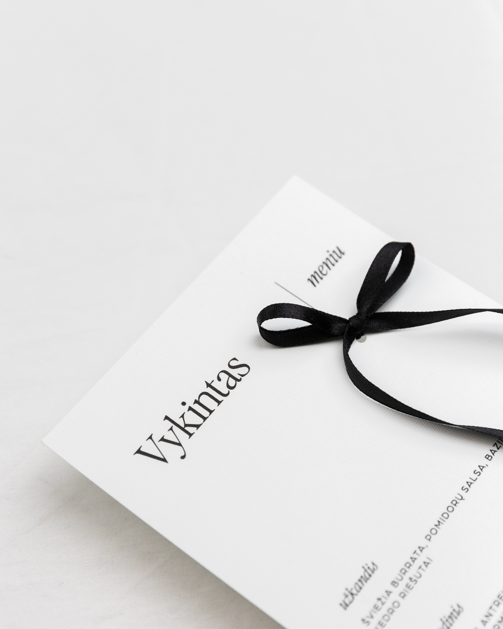 • vardo kortelės ARBA vardiniai meniu su vienu bendru meniu visiems svečiams (jeigu meniu su skirtingais pasirinktais patiekalais kiekvienam svečiui, papildomo meniu maketavimas + 6 eur)